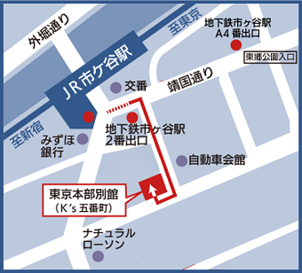![]() ・JR「市ヶ谷駅」より徒歩3分 ・都営新宿線、東京メトロ南北線・有楽町線「市ヶ谷駅」(2番口)より徒歩3分 |